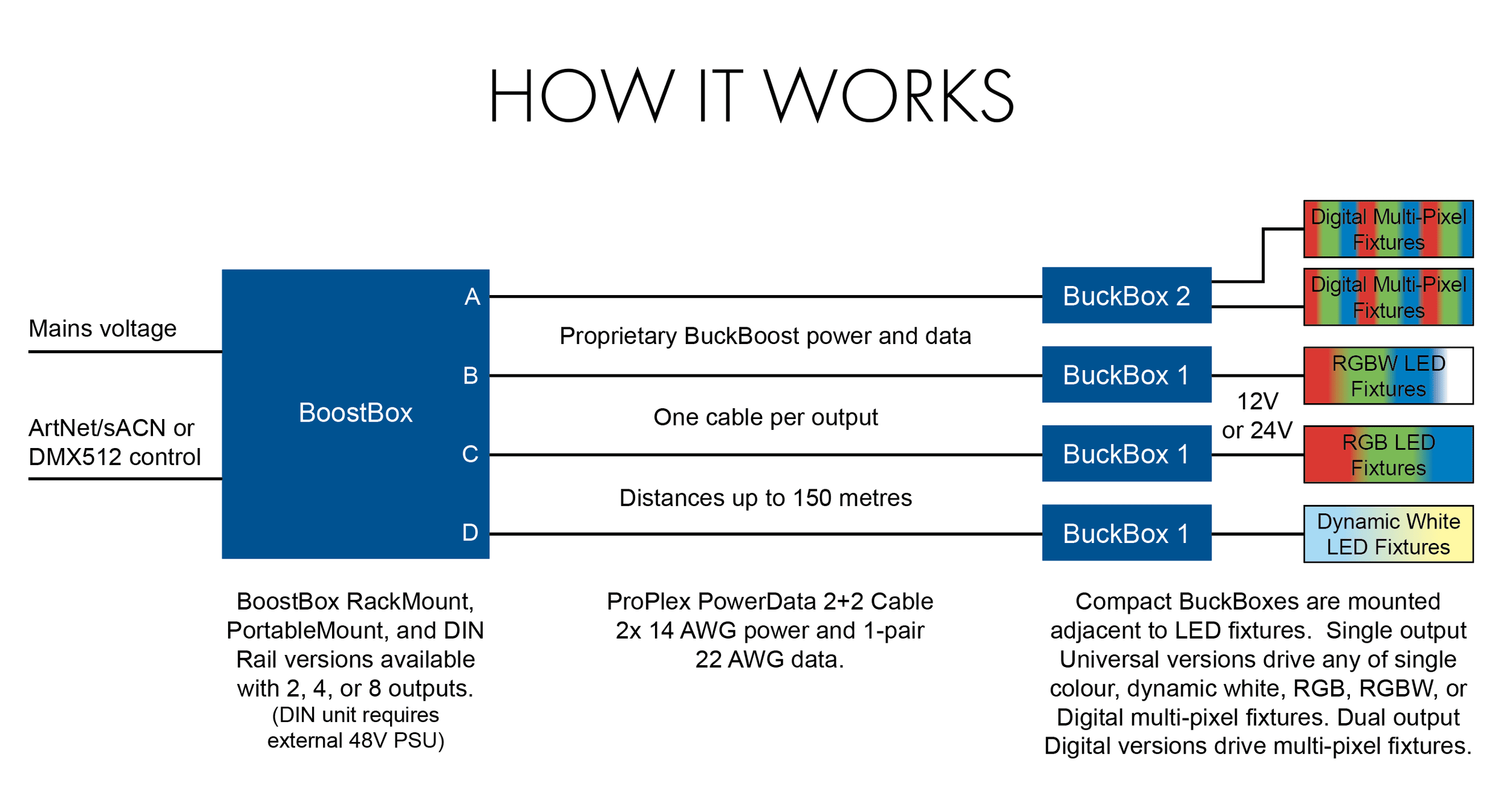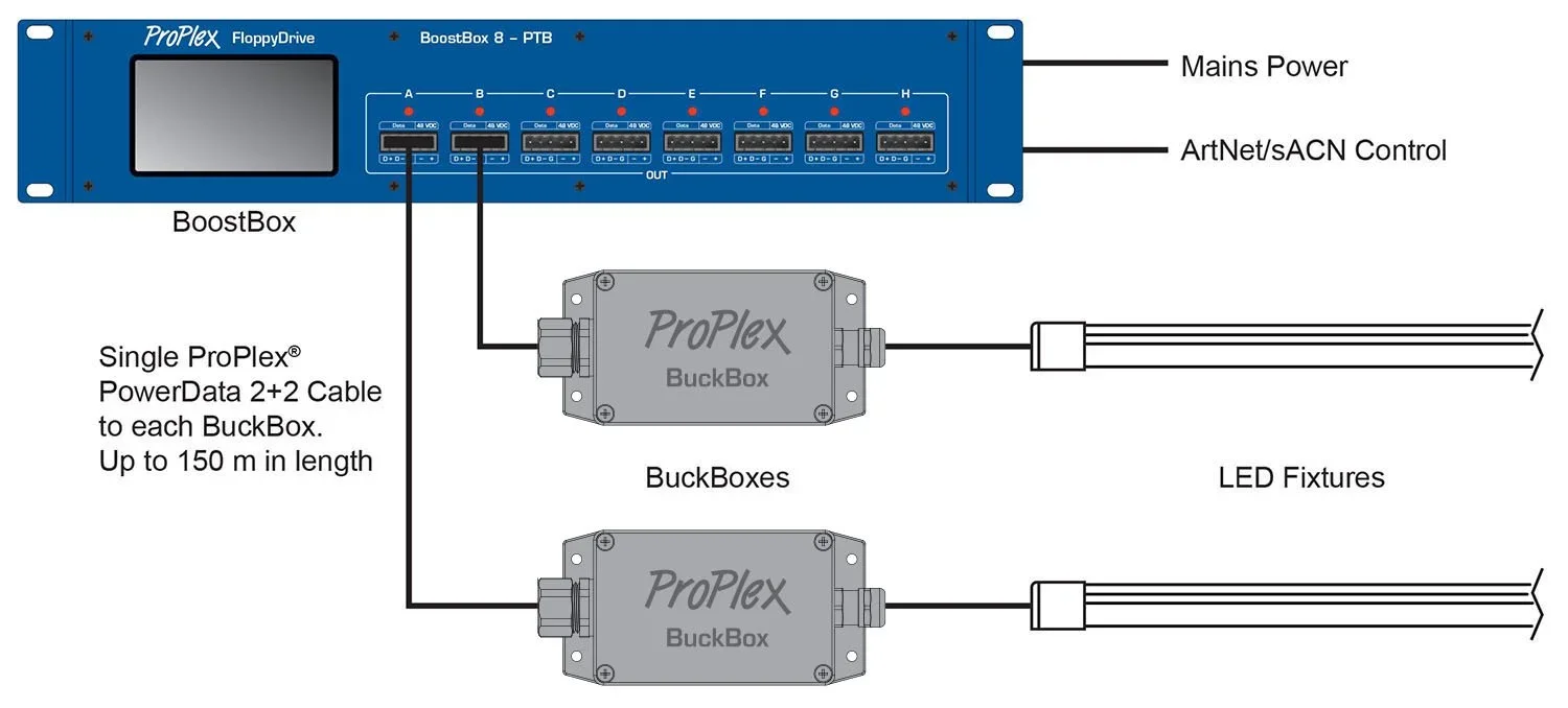 Single ProPlex® PowerData 2+2 Cable to each BuckBox. Up to 150 m in length!